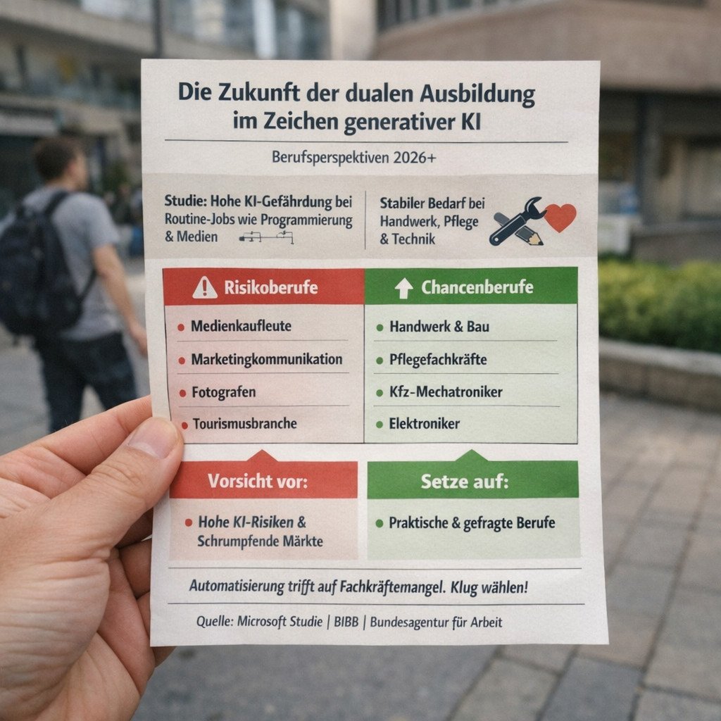 Die Konsequenz ist eine neue Entscheidungsroutine: Aufgabenprofil plus Markt plus Trend. Generative KI wird überall Teil der Ausbildung, aber sie ersetzt nicht die Wahl eines robusten Marktes und eines Ausbildungsbetriebs, der die Veränderungen realistisch abbildet.